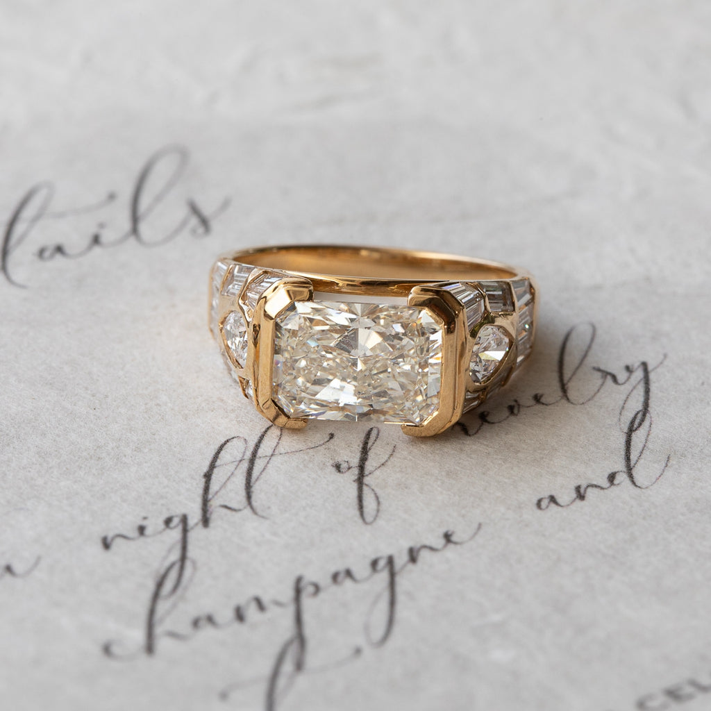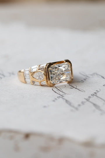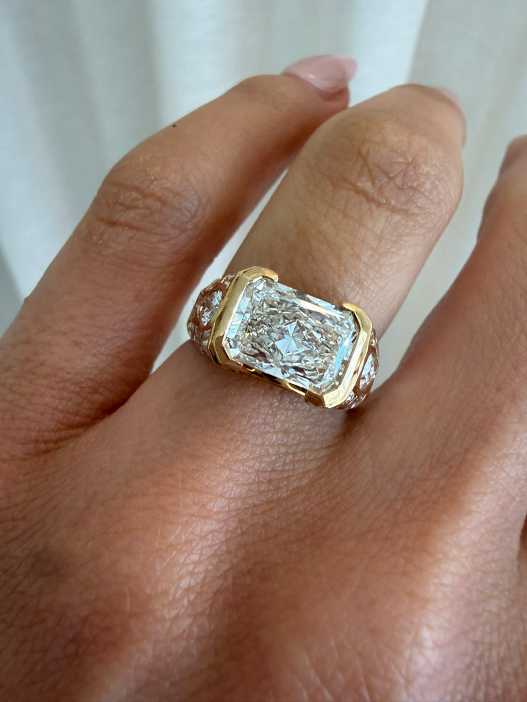 • Lab Grown (G VVS2) or Natural Diamond (available upon request) 2.8ct Radiant-cut centre stone.